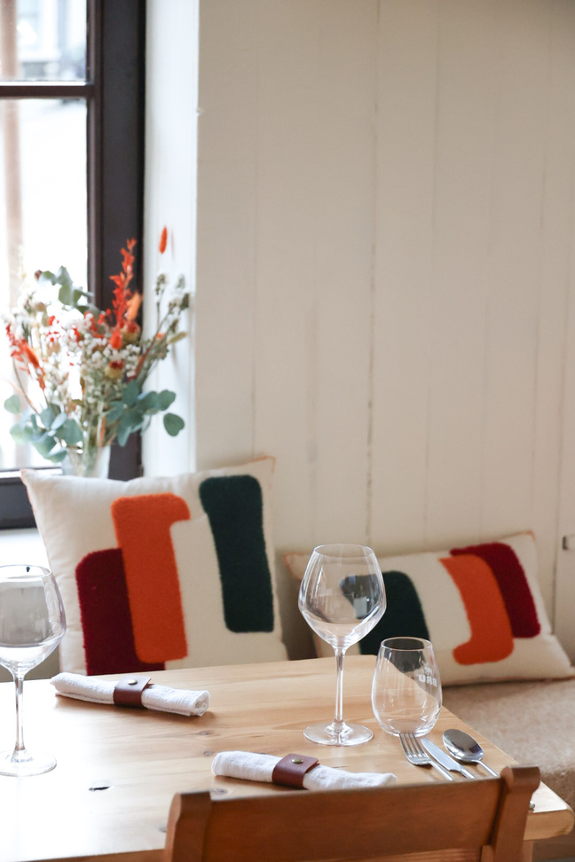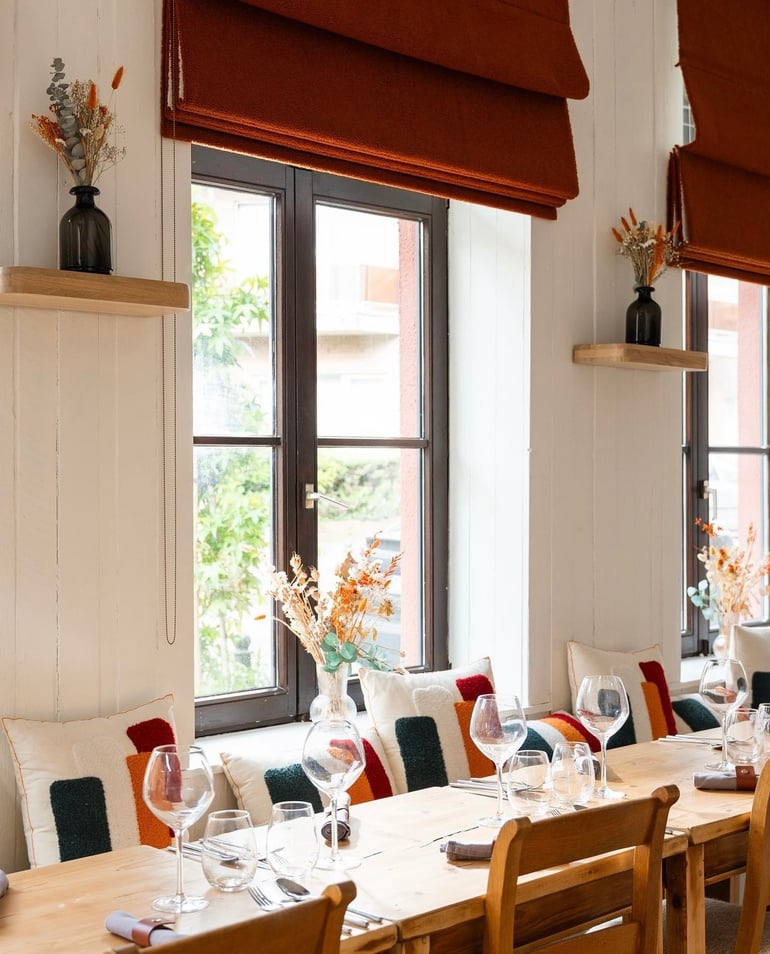Chez Babam, chaque détail compte : des chaises restaurées avec soin aux stores oranges foncés qui ajoutent une note chaleureuse et contrastée aux murs lambrissés en bois peint en blanc.