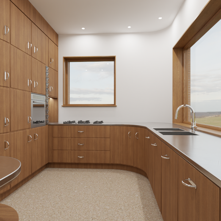 Projet pour une cuisine CUBEX en bois massif. De grandes ouvertures illuminent l’espace et subliment un magnifique terrazzo.